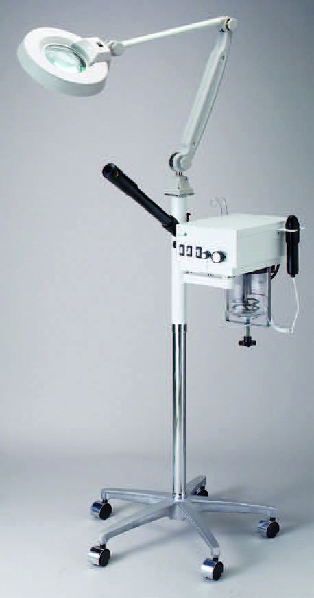 Vaporizer with high frequency magnifying lamp, weighted pole, extra large wheels for easy rolling over carpets. Made in USA. NO TOOLS REQUIRED.